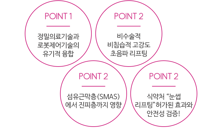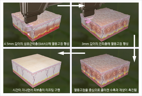 고강도 집속 초음파(High Intensity Focused Ultrasound)를 로봇제어 기술로 정밀하게 통제하여 피부 속 진피층 피하섬유근막층(SMAS)에 초점을 맺히게 하여 균일한 연속적인 열응고존을 생성하고 콜라겐, 탄력섬유 재생을 촉진시켜 수개월에 걸쳐 점진적인 피부당김, 리프팅효과를 얻을 수 있습니다.