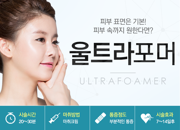 울트라포머는 고강도집속포음파(High Intensity Focused Ultrasound)를 피부 속 깊은층과 얕은 층에 동시에 강하게 투입하여 열응고존을 형성함으로써 콜라겐, 탄력섬유 재생을 촉진시켜 리프팅 효과를 얻을 수 있는 첨단 초음파 리프팅 시술입니다.