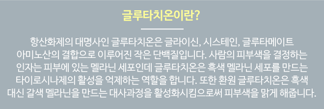 글루타치온주사는 피부 미백과 노화 방지에효과적인 '글루타치온' 성분을 체내에 정맥요법으로 투여하는 시술입니다. 글루타치온이 멜라닌 합성을 억제하고 피부를 하얗게 만들며, 피부 노화 방지 및 피부에 탄력을 줄뿐 아니라 윤기가 흐르도록 도와주어 자연스럽게 피부 미백효과를 나타내도록 하는 방법입니다.