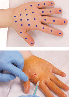 인슐린 주사기로 면적에 따라 10~30포인트로 나누어 보톨리눔톡신을 얕게 주사함으로써 손다한증을 치료합니다.