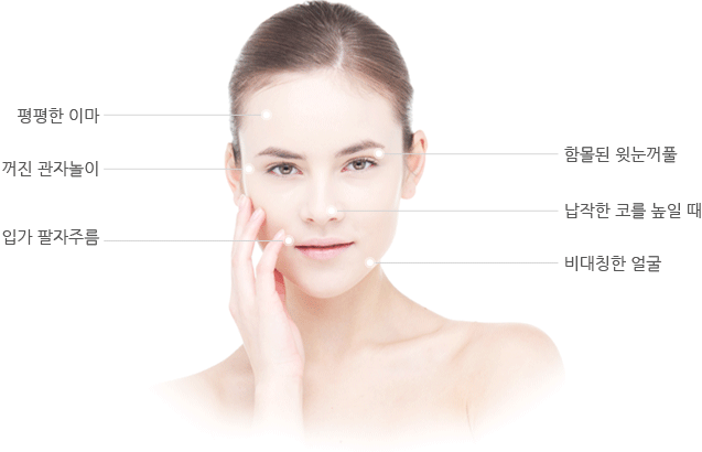 젊은 사람의 얼굴은 자연스럽고 탄력적이며 동그란 곡선을 이루는데 반해, 30대 이후로 접어들면서 얼굴에 살이 없고 탄력도 떨어져 윤기가 없어지며 주름이 많이 잡히는 게 됩니다. 얼굴의 경우 매우 증상이 심하며 탱탱했던 볼살이 축 쳐짐과 눈도 수척해질 수 있으며, 이마나 눈가, 입가 쪽에 주름살이 명백히 드러나며 코 주변도 움푹 패여 얼굴 전체적으로 탄력이 떨어져 나쁜 인상을 줄 수 있습니다.