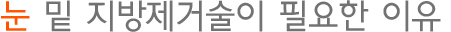 눈 밑의 지방은 선천적으로 많은 경우도 있지만, 대개는 나이가 들면서 생기는 노화의 일종인 경우가 많습니다. 피부가 노화되면 탈수현상이 일어나 피부가 얇아지고 근육이 느슨해지게 됩니다. 결국 피부가 축 처지게 되고 눈 아래쪽의 안과 지방을 지탱하던 격막이 느슨해지면 눈 밑 지방이 돌출되어 보이게 됩니다. 이 같은 현상은 나이가 들어감에 따라서 나타나기도 하지만 개인에 따라서 젊은 나이에도 피부의 특성에 따라서 이런 현상이 나타날 수 있습니다.